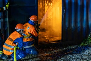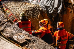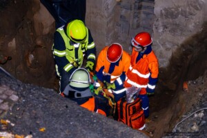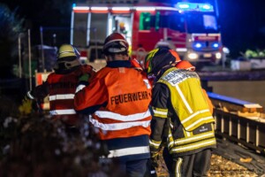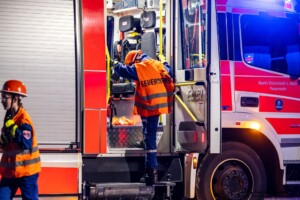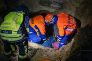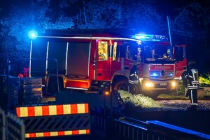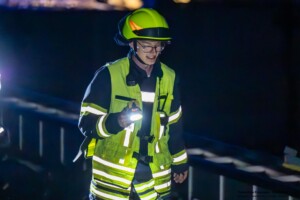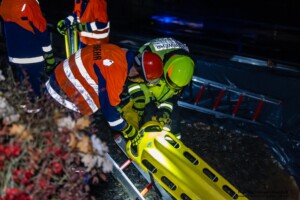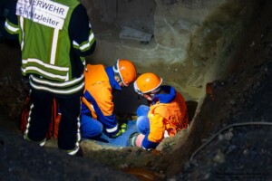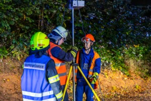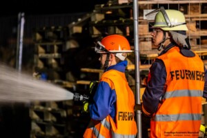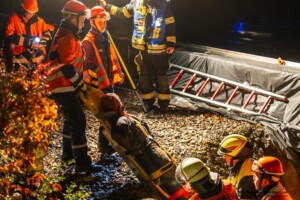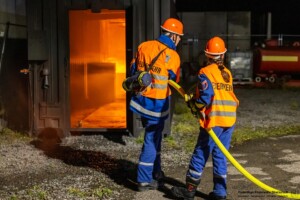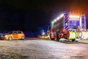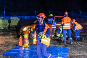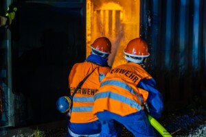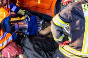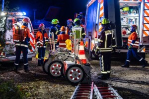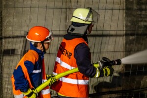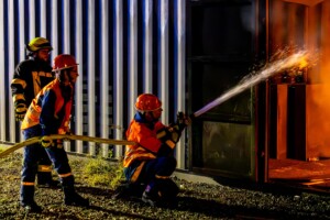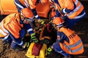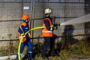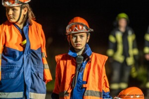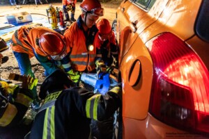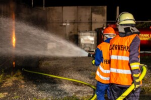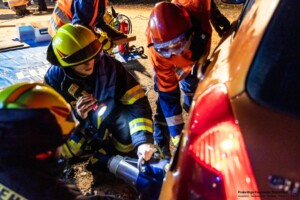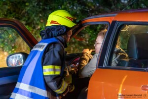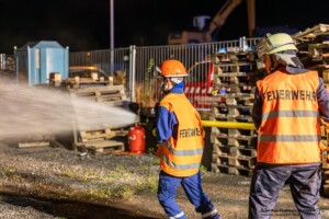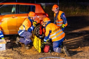 Dort hatten die Übungsleiter unterschiedliche Szenarien für die jungen Feuerwehrleute vorbereitet: Am Brandübungscontainer wartete ein loderndes Feuer auf die Jugendlichen, das es zu bekämpfen galt. Nach einer kurzen Pause im Feuerwehrhaus ging es für die Jugendlichen zu einer verunglückten Person, die in eine Grube gerutscht war und nun gerettet werden musste. Einige Zeit später erfolgte eine Alarmierung zu einem Verkehrsunfall, bei dem eine Person unter ein Auto geraten war.