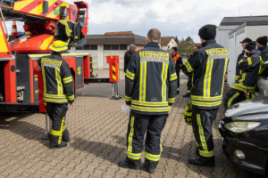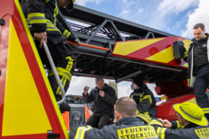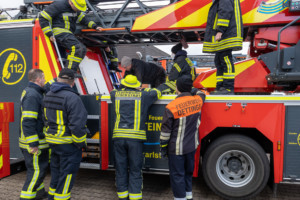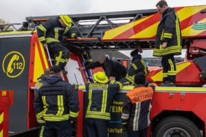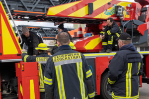 Die erste Gruppe Feuerwehrleute wurde bereits gestern in Karlstein geschult. Die zweite Gruppe war heute im Feuerwehrhaus Stockstadt an der Reihe. Neben dem regulären Betrieb der Drehleiter standen heute eine ganze Reihe Sonderfunktionen und der Notbetrieb im Fokus.