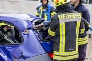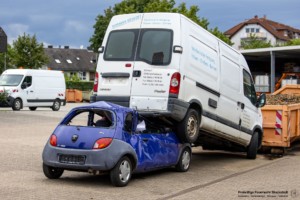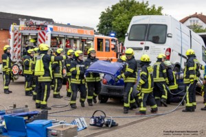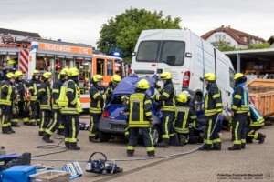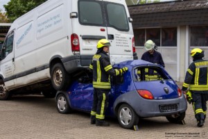Ein verkehrsbedingter Stau auf einer Bundesstraße – ein nachfolgender PKW kann bei hoher Geschwindigkeit nicht mehr bremsen und schiebt sich unter den Kleintransporter vor ihm. Bei Insassen sind schwer eingeklemmt. Auch der Fahrer des Kleintransportes ist verletzt. So könnte es jeden Tag auf den Straßen rund um Stockstadt passieren. Heute war dies das Szenario für die Abschlussübung vor der Sommerpause für unsere Löschzüge 1 und 2.