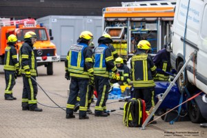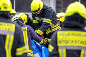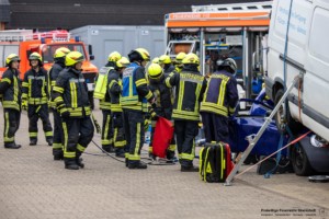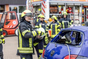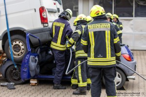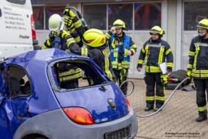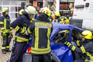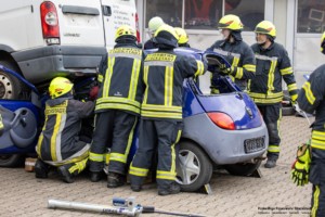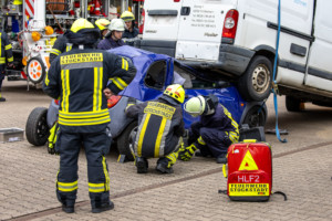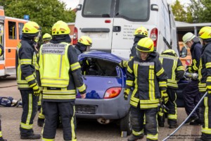 Angerückt mit einem Rüstzug, bestehend aus Einsatzleitwagen (ELW 1), zwei Hilfeleistungslöschfahrzeugen (HLF 20), Rüstwagen (RW 1) und Versorgungslastwagen (V-LKW) hat sich unsere Mannschaft der Herausforderung gestellt. Nach der Sicherung der beiden Fahrzeuge gegen Verrutschen wurden die Verletzten mit hydraulischem Rettungsgerät befreit. Wie immer bei solchen realistischen Übungen wurde das Vorgehen in der Nachbesprechung reflektiert und Handlungsalternativen besprochen.