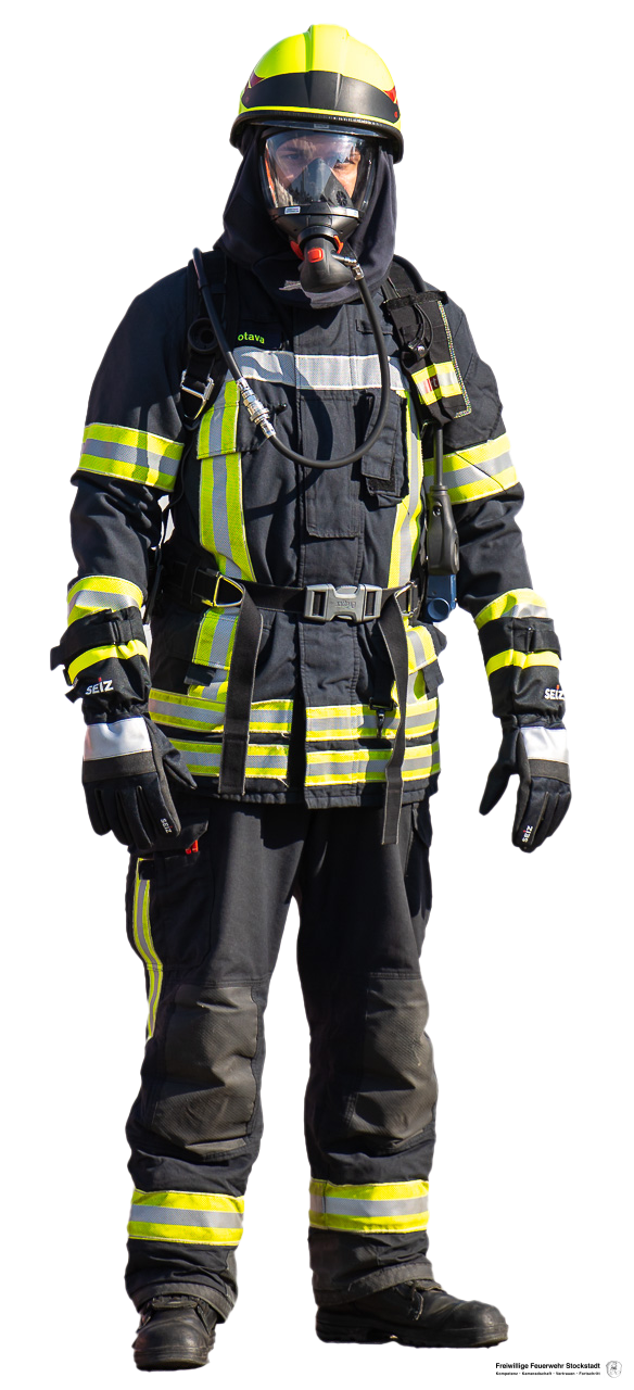 mit persönlicher Schutzausrüstung (Stiefel, Schutzanzug, Helm inkl. Nomex-Nackenschutz, Brandschutzhandschuhe), Atemschutzmaske und umluftunabhängiges Atemschutzgerät.