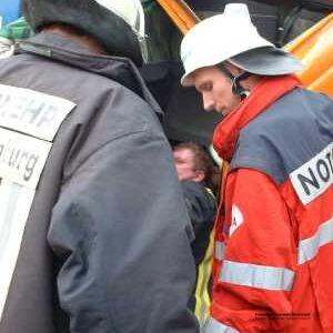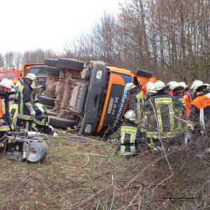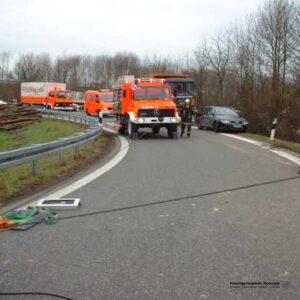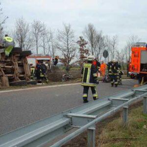 Unterstützung FW Dettingen. Ein LKW war in der Ausfahrt Karlstein umgestürzt. Der Fahrer in seinem Fahrerhaus eingeschlossen. Den Feuerwehrleuten gelang es schließlich durch besetigen von Unterholz und Erde den Fahrer zu befreien.