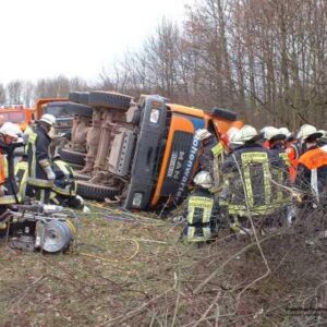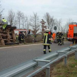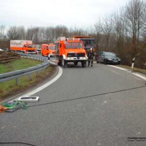 Unterstützung FW Dettingen. Ein LKW war in der Ausfahrt Karlstein umgestürzt. Der Fahrer in seinem Fahrerhaus eingeschlossen. Den Feuerwehrleuten gelang es schließlich durch besetigen von Unterholz und Erde den Fahrer zu befreien.