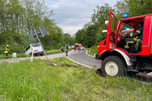 Von der Feuerwehr wurde der Kleintransporter zunächst mit einem Greifzug gegen weiteres Abrutschen gesichert. Mit Hilfe der Seilwinde des Rüstwagens RW1 wurde der Transporter wieder zurück auf die Fahrbahn geholt. Anschließend wurde noch die Fahrbahn von aufgewühlter Erde gesäubert.
