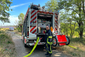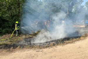 Umgehend wurden zwei Strahlrohre vorgenommen und der Brand mit Wasser aus den Wassertanks der beiden Löschfahrzeuge bekämpft. Durch das gerade noch rechtzeitige Eingreifen der Feuerwehr konnte das Feuer schnell gelöscht werden und eine Ausbreitung auf den Wald verhindert werden. Die Brandstelle wurde von der Feuerwehr mit einer Drohne überflogen, um sicherzustellen, dass sich durch Funkenflug keine weiteren Stellen im Umkreis entzündet haben.