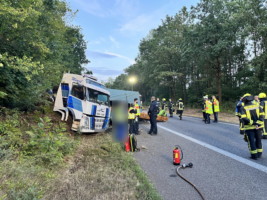 Kurz nach 5 Uhr wurden wir zu einem Verkehrsunfall mit Beteiligung eines LKWs auf die A3 alarmiert. Laut Unfallmeldung über die Polizei sollte der LKW umgestürzt sein und seine Ladung teilweise verloren haben. Beim Eintreffen der ersten Einsatzkräfte konnte der LKW im Bereich der Überleitung von der A3 in Fahrtrichtung Frankfurt auf die A45 in Fahrtrichtung Gießen in der Böschung aufgefunden werden. Der Auflieger des LKW war umgestürzt, die Ladung bestehend aus ca. 24 Tonnen Eisenstangen, hatte sich gelöst und war zum Teil auf die Fahrbahn gefallen. Wir sicherten bis zum Eintreffen der Straßenmeisterei die Unfallstelle ab und versorgten den LKW-Fahrer, bis der Rettungsdienst vor Ort war. Nach ersten Erkenntnissen wurde der Fahrer leicht verletzt. Bis zum Eintreffen des Bergungsunternehmens gegen 7 Uhr waren noch zwei Fahrzeuge zur Absicherung an der Einsatzstelle.