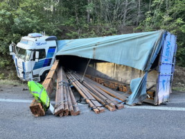 Am Montagmorgen, gegen 4.45 Uhr, beabsichtigte ein Lastkraftwagenfahrer von der Autobahn 3 kommend auf die Autobahn 45 in Richtung Gießen zu fahren. In der Kurve verlor der Fahrer aus bislang ungeklärten Gründen die Kontrolle über seinen Lastkraftwagen und kam von der Fahrbahn ab, wobei der mit Stahlträgern beladene Anhänger umkippte. Der Lastkraftwagenfahrer wurde umgehend vom Rettungsdienst behandelt. Die Zufahrt zur Autobahn 45 ist derzeit voll gesperrt. Ein Bergungsdienst ist verständigt. – Polizeipräsidium Südosthessen