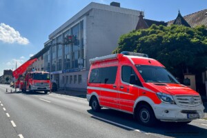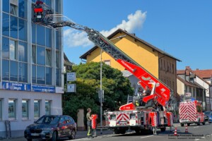 Die Feuerwehr wurde vom Rettungsdienst mit der Drehleiter angefortert. Eine Person konnte nicht durch das Treppenhaus nach unten gebracht werden. Sie wurde über den Rettungskorb der Drehleiter auf einer Trage nach unten gefahren.