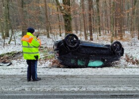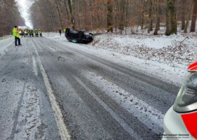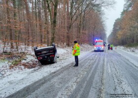 Die Feuerwehr Stockstadt wurde am Montag, 04.12.2023 um 14:29 Uhr zu einem Verkehrsunfall auf die B26 im Bereich der Landesgrenze alarmiert. Bei einsetzendem Schneefall hatte sich witterungsbedingt ein Fahrzeug überschlagen. Im sich daraufhin bildenden Stau kam ein weiteres Fahrzeug von der Fahrbahn ab und rutschte in die seitliche Böschung.