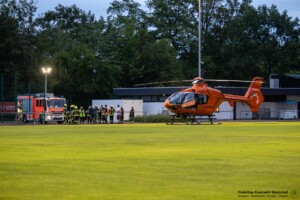 Um bei einbrechender Dunkelheit einem Rettungshubschrauber eine sichere Landung zu ermöglichen, wurde von uns das Waldstadion geöffnet und die Flutlichtanlage in Betrieb genommen. Mit dem Mannschaftstransportwagen (MTW) haben wir den Notarzt an die Einsatzstelle im Ortsgebiet gefahren.