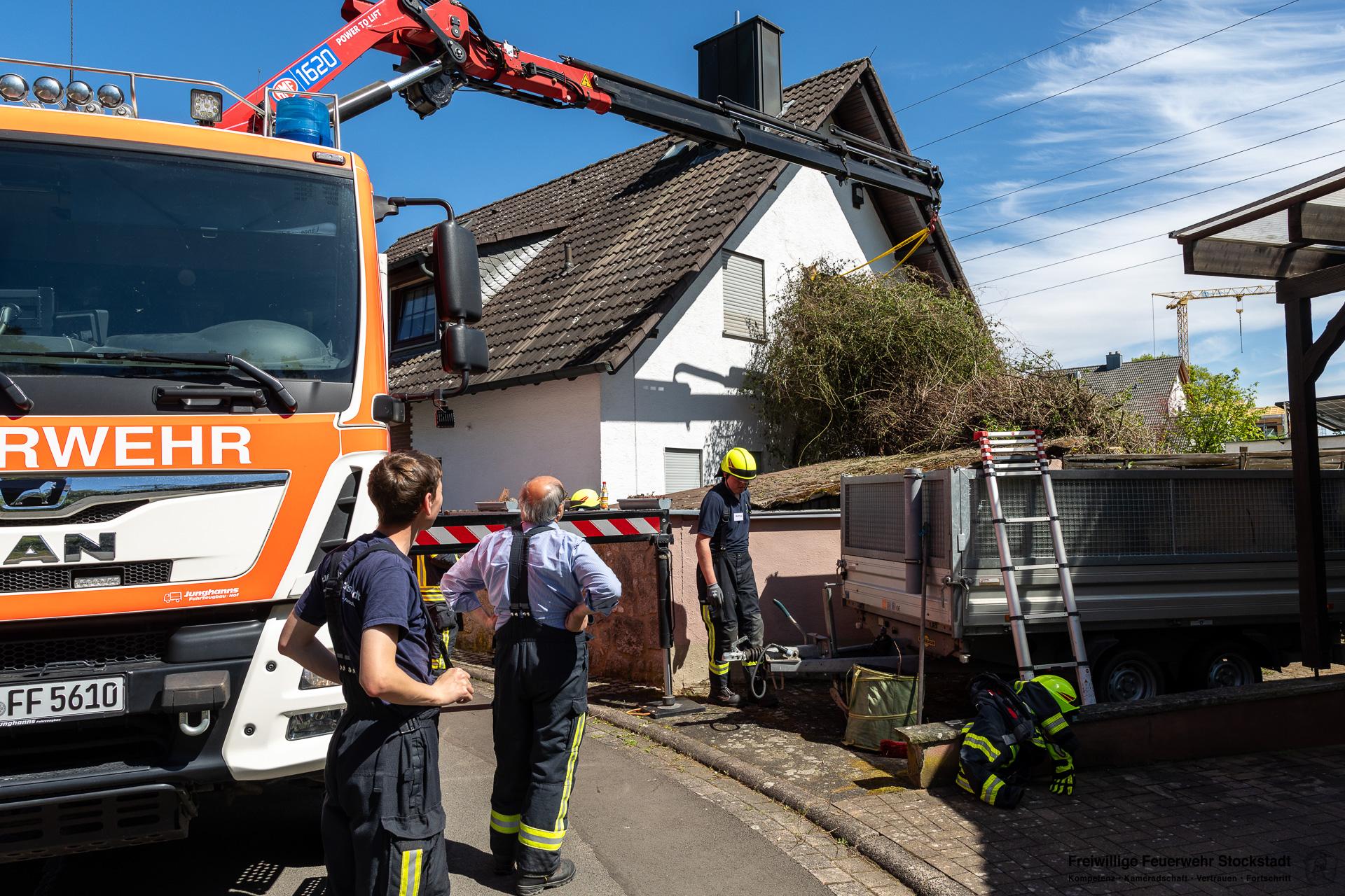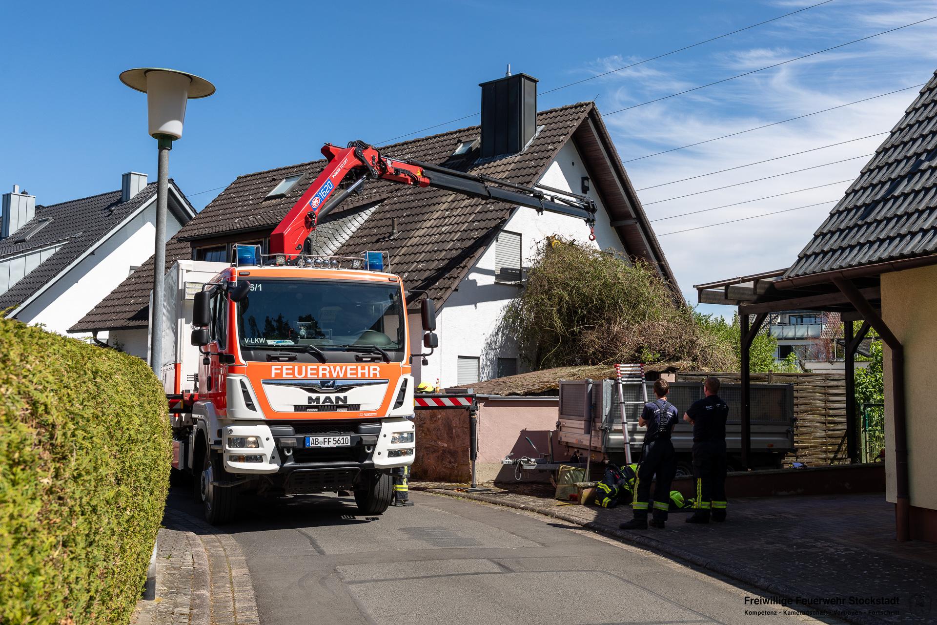 Die Feuerwehr Stockstadt wurde heute zu einem morschen Baum gerufen, der auf ein Wohnhaus gekippt war. In der vorgefundenen Lage drohte er, erhebliche Schäden an dem Haus zu verursachen. Eine gefahrlose Beseitigung war für den Eigentümer nicht möglich. Mit dem Ladekran unseres Versorgungslastwagens (V‑LKW) gelang es uns, den Baum vom Haus wegzugeben und umzulegen. In dieser Lage kann der morsche Baum gefahrlos zerlegt werden.