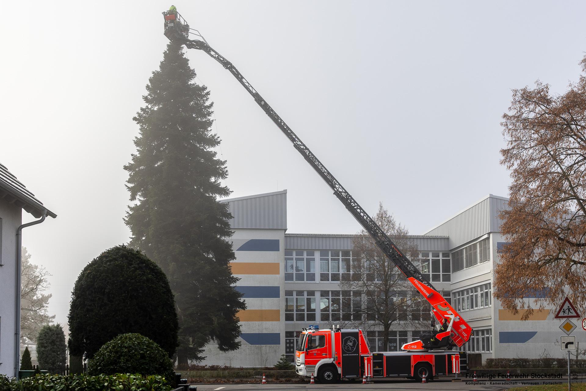 Die Feuerwehr Stockstadt unterstützt heute die gemeindlichen E-Werke beim Anbringen der Weihnachtsbeleuchtung an Stockstadts höchsten Weihnachtsbaum an der Mittelschule. Bei dichtem Nebel und eisigen Temperaturen haben wir die tapferen Elektriker mit der Drehleiter bis an die Baumspitze hochgefahren. Stück für Stück bringen sie die Weihnachtsbeleuchtung an dem Baum an. Wir freuen uns schon darauf, wie