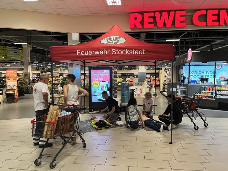 Gleich an zwei Info-Ständen konnten Interessierte in Stockstadt kostenfrei ihr Erste-Hilfe-Wissen auffrischen und die Erstmaßnahmen einer Reanimation praktisch üben. Im Stockstädter Waldschwimmbad sowie im REWE