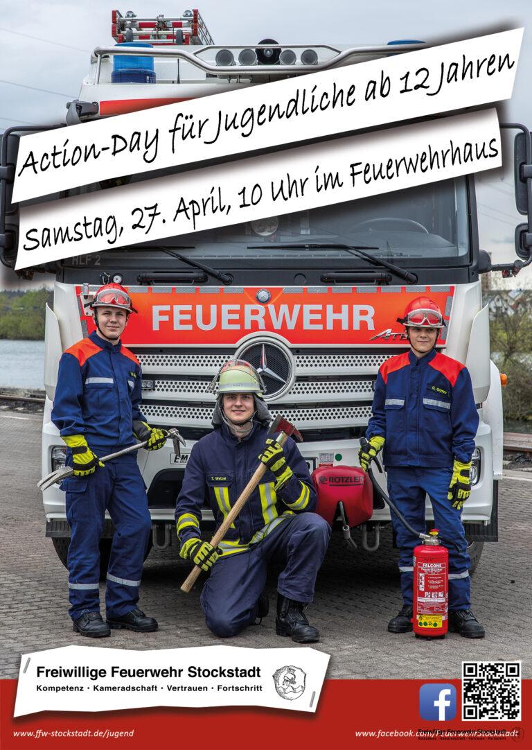 Bei bestem Wetter startete am Samstag um 10:00 Uhr der Action-Day der Stockstädter Feuerwehr. Insgesamt 15 Mädchen und Jungen kamen zur Feuerwehr, um einen Tag in die spannende Welt der Feuerwehr einzutauchen. Nach dem Einkleiden in Schutzanzüge und einem Rundgang durch das Feuerwehrhaus ging es gleich an die Gerätschaften. An der ersten Station lernten die Jugendlichen die unterschiedlichen Strahlrohre der Feuerwehr kennen und konnten diese in der Praxis erproben. An der zweiten Station ging es mit der Drehleiter hoch hinaus über die Dächer von Stockstadt. Richtige Flammen konnten am ‚FireTrainer‘ bekämpft werden….